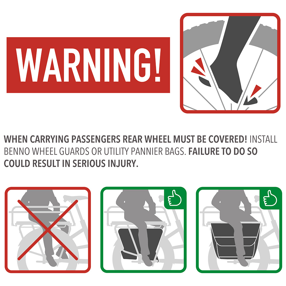 WARNING: When carrying passengers, rear wheel MUST be covered! Install Benno Wheel Guards or Utility Pannier Bags. Failure to do so could result in serious injury! Make sure that no parts of the body, clothing or load come near moving parts on the bicycle, such as chain, spokes, tyres or brakes.