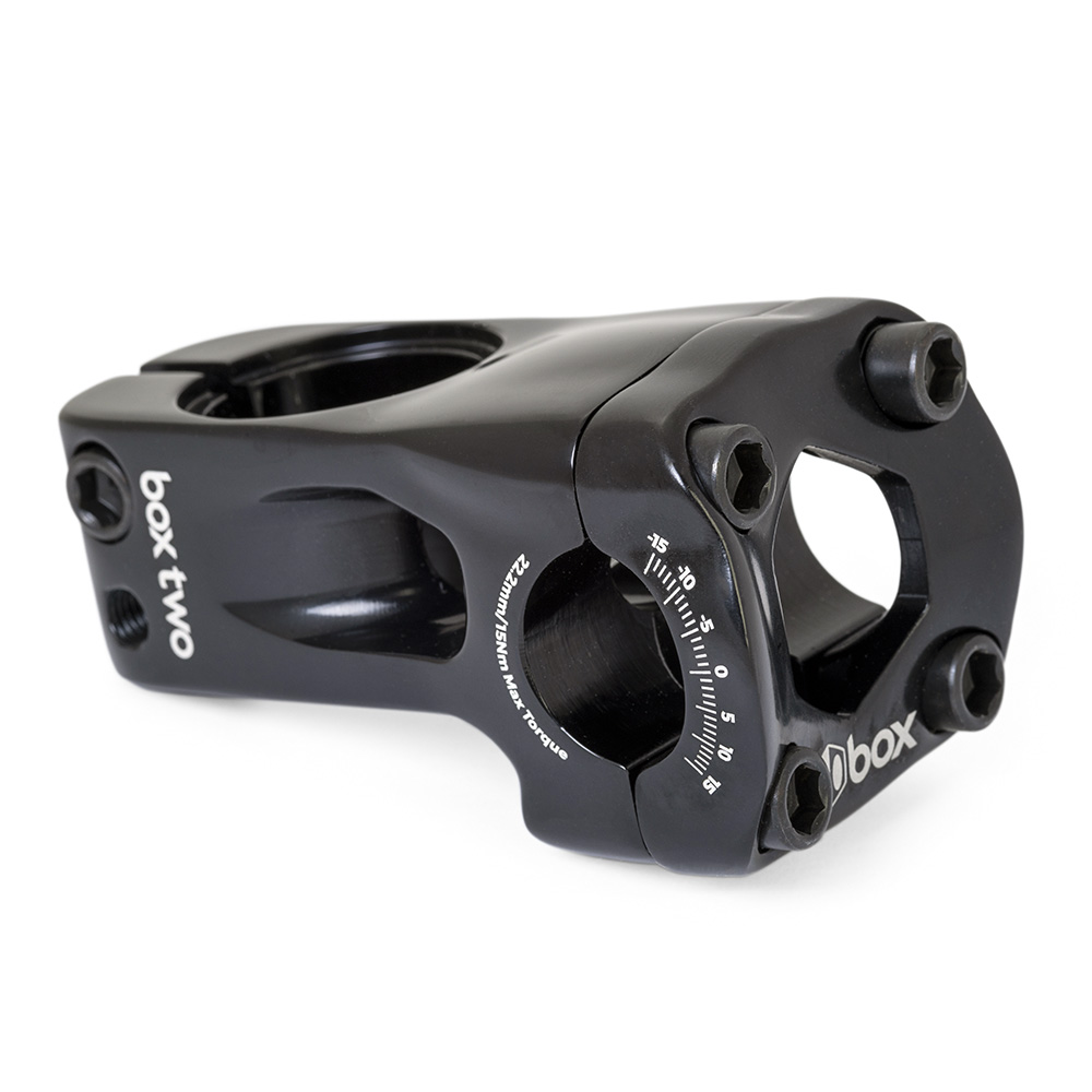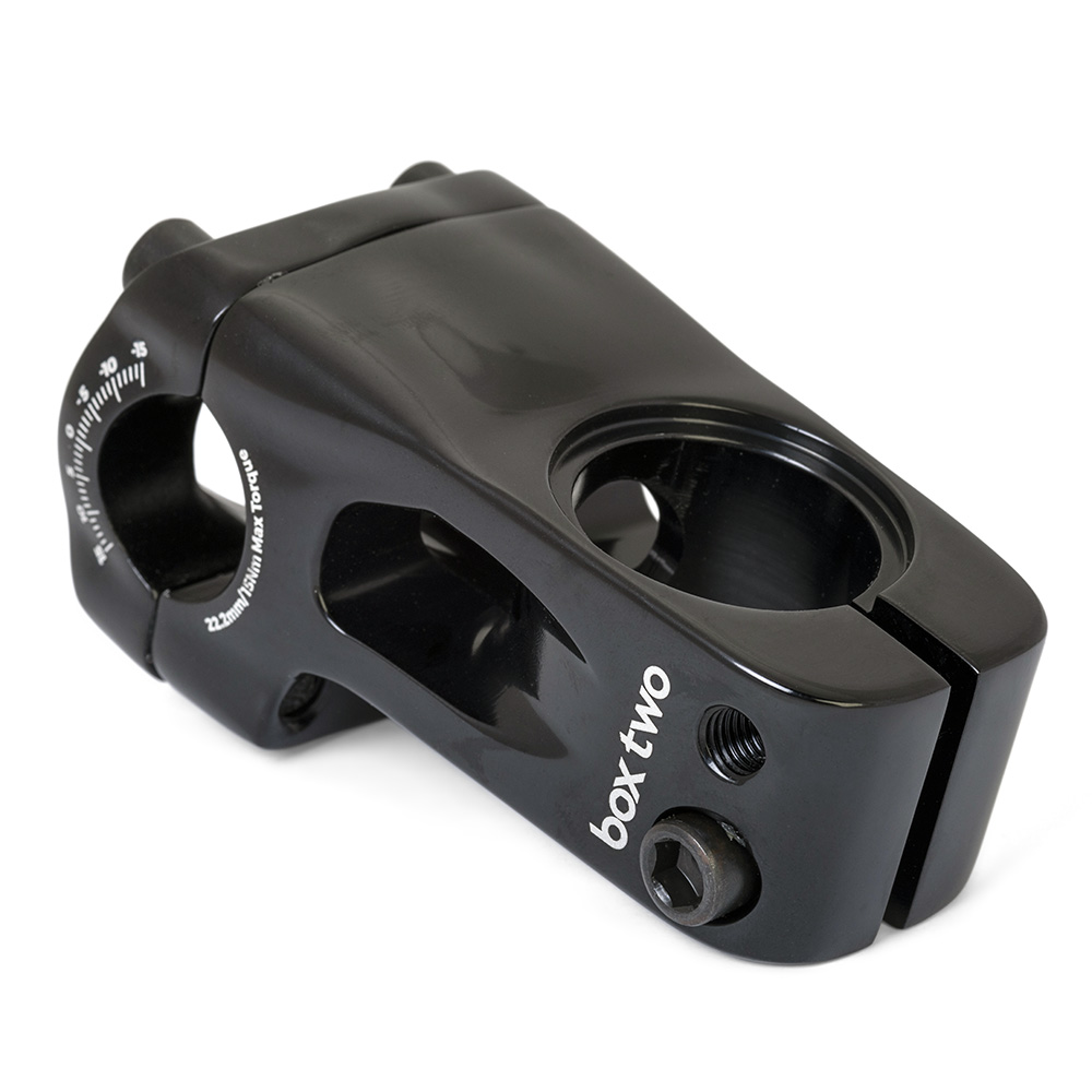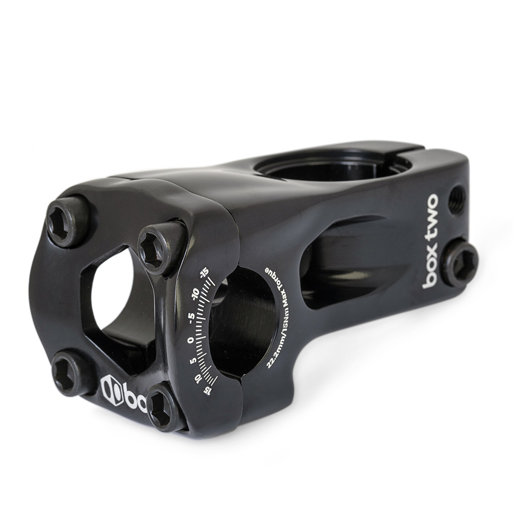 The Box Two front Load is a modern, 22.2 stem designed specifically for BMX racing. Box Two Front Load stem bodies are cold-forged and CNC-machined from the highest quality 6061-T6 aluminium.The front-load clamp is designed to fight pull-up forces while offering superior strength.