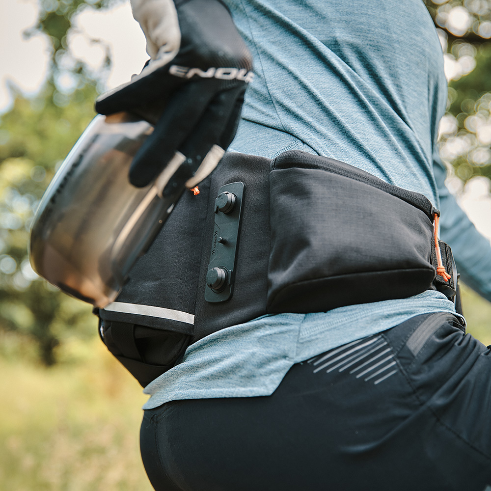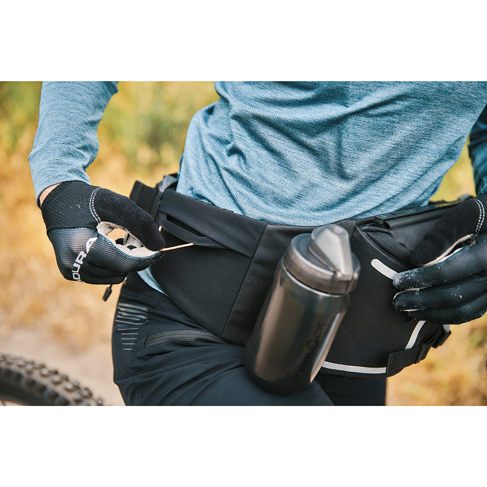 Designed for cycling with increased storage needs, the HIP BELT double features a large, compressible storage compartment, as well as crossed, flexible straps for attaching a rain jacket and more. Two additional pockets are provided for storing keys and other small essentials. Furthermore, two TWIST bases are integrated to carry compatible TWIST 450 water bottles, ensuring optimal hydration on longer rides.