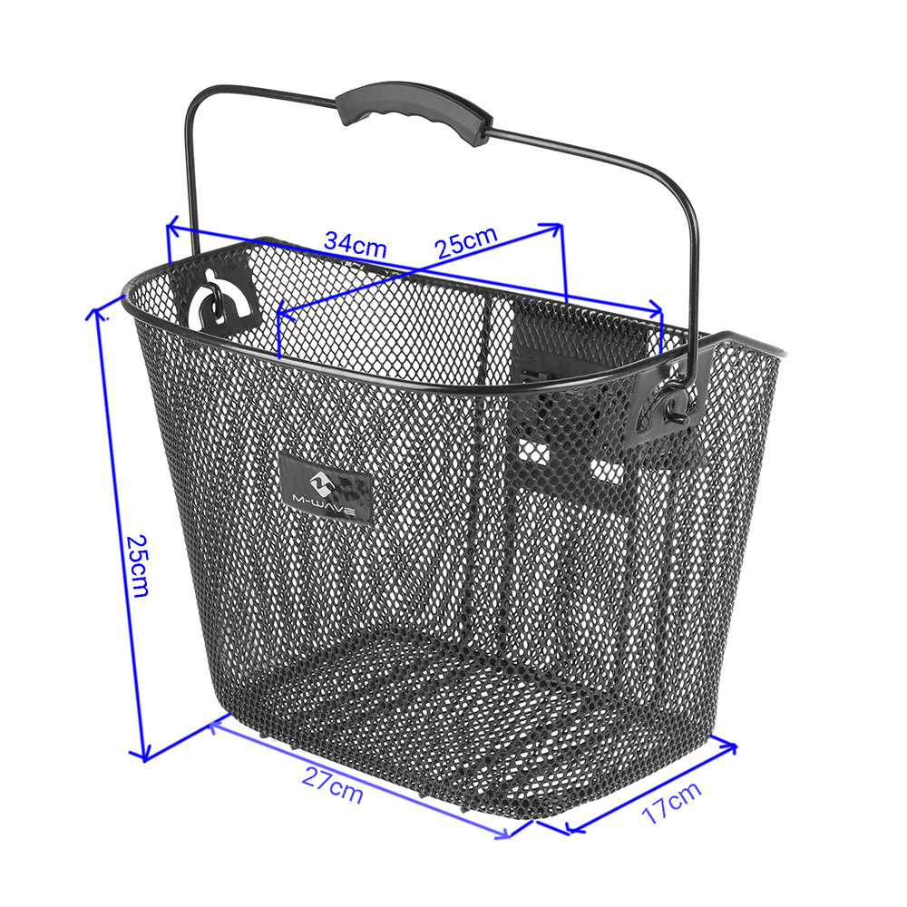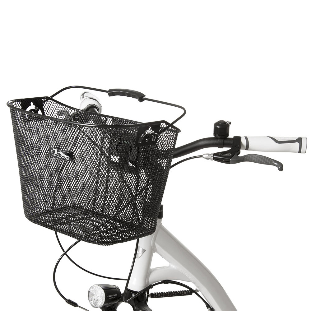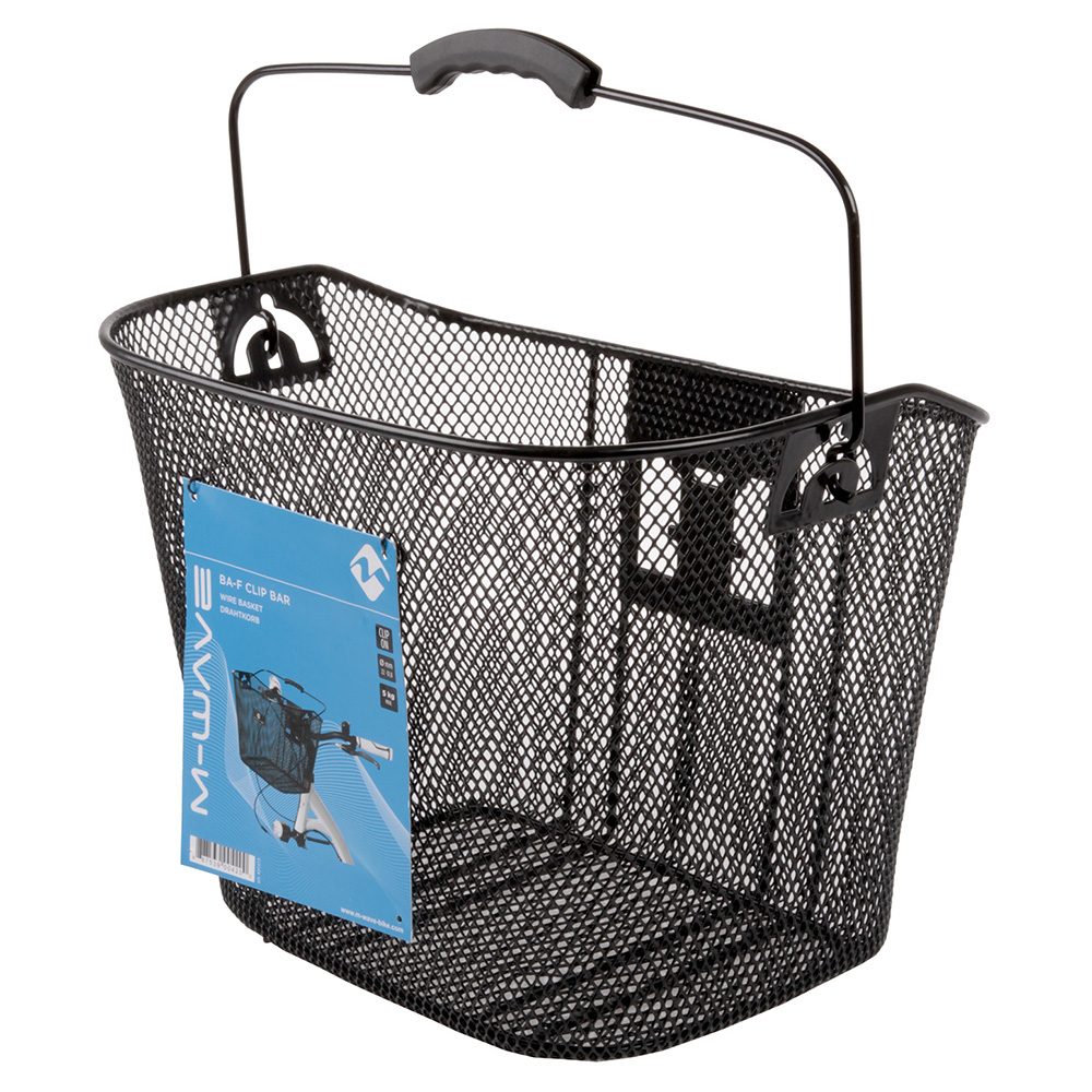 Wire mesh basket with easy-to-use handlebar-mounted plastic Quick Release bracket.