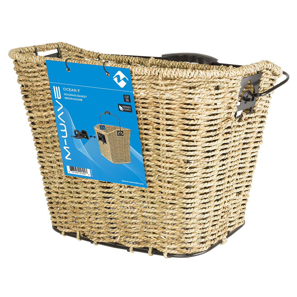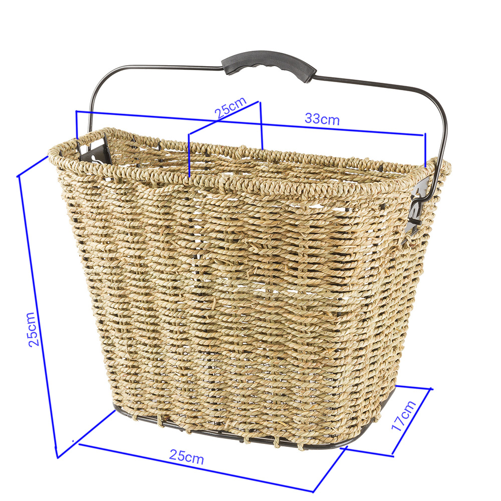 Stylish Sea Grass (Ratan style) interwoven into a strong metal wire frame basket body with easy-to-use handlebar mounted plastic Quick Release bracket.