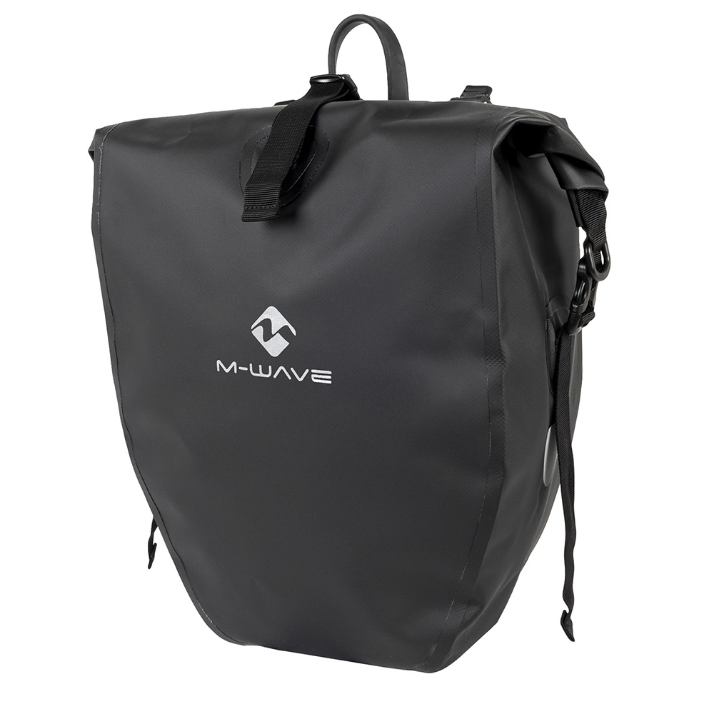 Waterproof pannier with welded seams and roll top.