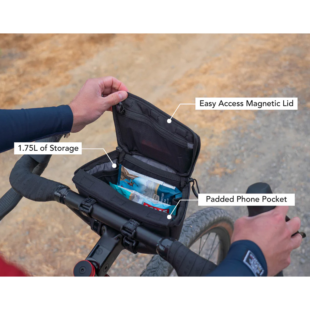The bag features a magnetically secured top lid that enables easy single-handed access, even while riding. The lid also features two side zippers that secure contents over rough terrain. With a capacity of 1.75 litres, you can fit all your essentials: multiple tubes, tools, camera, snacks, etc. Multiple interior stash pockets and a dedicated padded phone pocket keep your gear organised and protected.