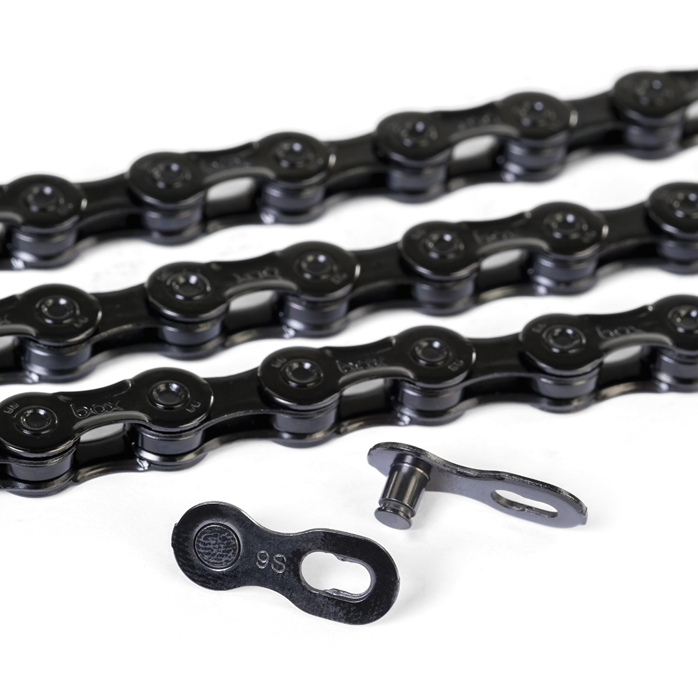 The Box One chain is protected by a dual-coating. Starting with a Nickel plating which aids in corrosion resistance and then top it off with the "Diamond-Like Carbon" layer. The DLC is as fancy as it sounds; a synthetic diamond nano-coating that turns up the volume on hardness, wear resistance, and slickness. All Prime 9 chains have chamfered shifting edges, solid plates and solid pins to safeguard durability. Our unique inner link spacing is engineered to grab those modern wide/narrow chainrings. Box has chosen to modernise the 9-speed platform due to the chain's spirited reputation.