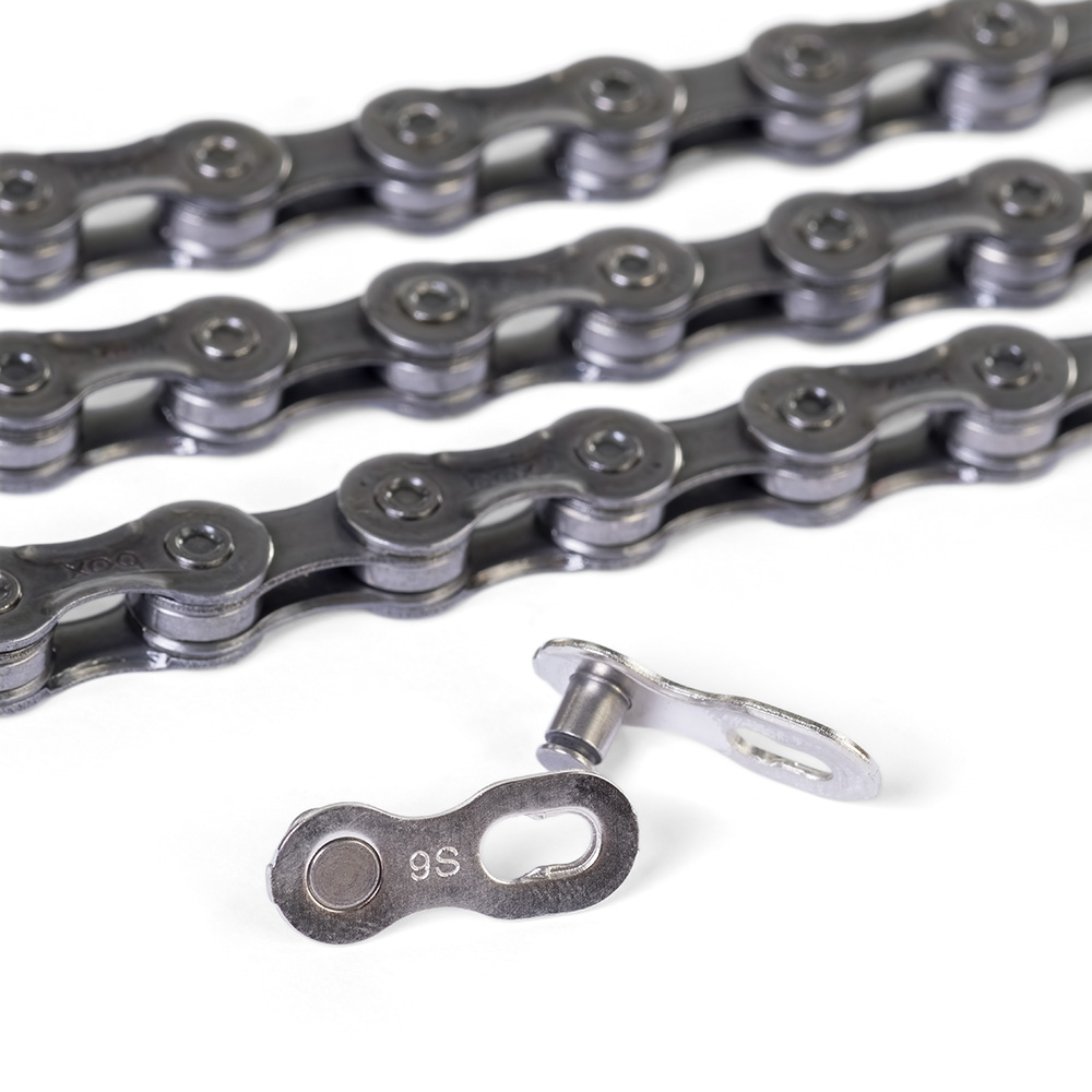 The Box Three chain is polished and then chemically treated to achieve corrosion resistance. All Prime 9 chains have chamfered shifting edges, solid plates and solid pins to safeguard durability. Our unique inner link spacing is engineered to grab those modern wide/narrow chainrings. We chose to modernize the 9-speed platform due to the chain's spirited reputation.