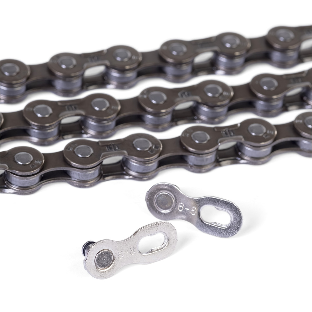 The Box Four chain employs an 8-speed platform in a similar strategy to the Prime 9 but at a great price point. The chain is polished and then chemically treated to achieve corrosion resistance. Box have engineered the inner link spacing to be a little tighter than other 8-speed chains and is optimized for use with our Box Four Wide/Narrow Chainring.