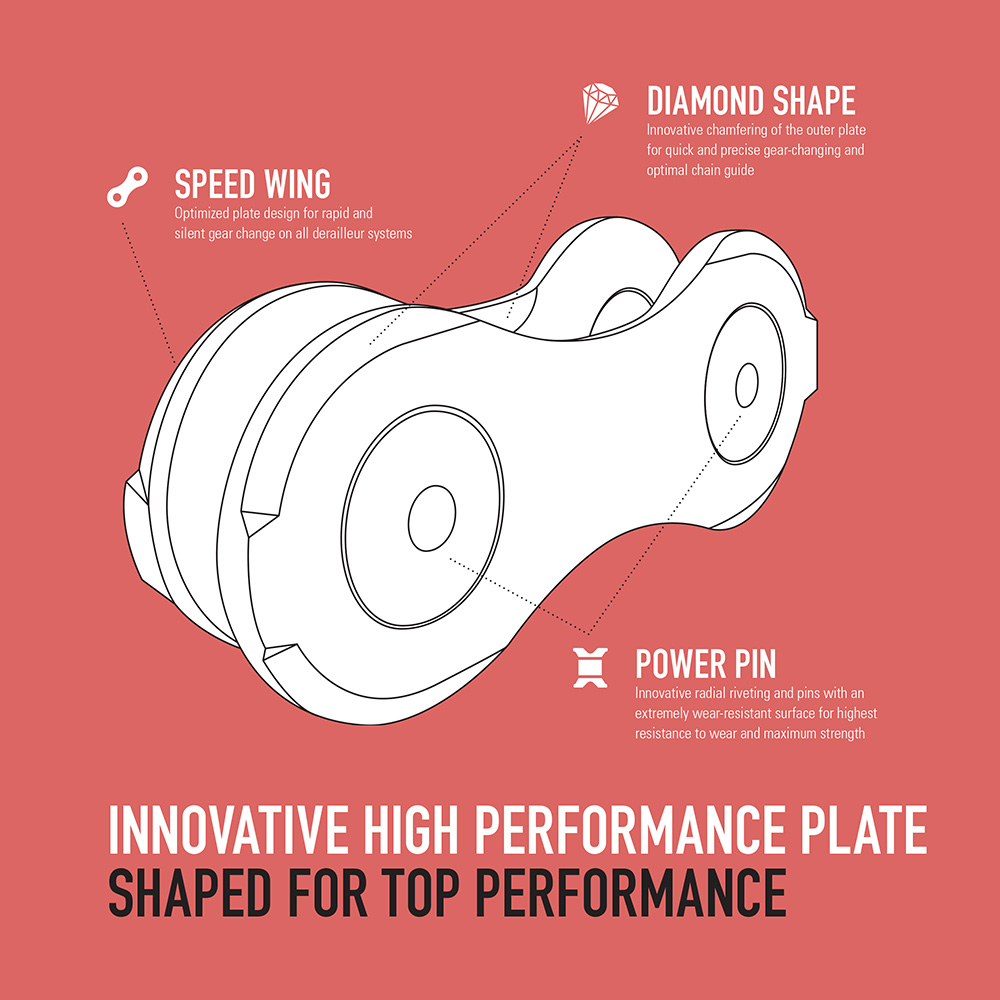 Highly developed Peripheral chamfering of the outer plate ensures optimum gear-changing performance. Innovative radial riveting of the pins, combined with a special pin coating, guarantees top performance and long wear, even under the high forces of cross gearing.
