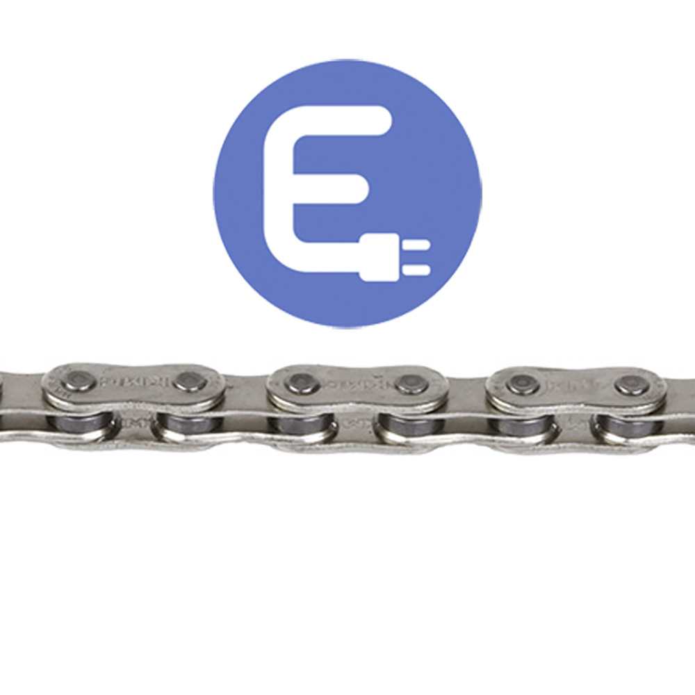 Re-enforced chain designed for use with Single Speed or Internal Gear Hub (IGH) E-bikes requiring the narrow 3/32” width chain type.