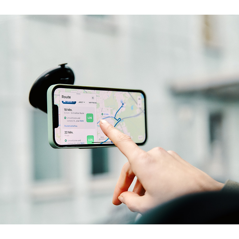 The magnetic counterpart is located on the smartphone. Either in the form of a special VACUUM mobile phone case or the universal VACUUM adhesive patch for your existing mobile phone case. The connecting piece makes it easy to attach the smartphone to the holder and holds it reliably on the windscreen. The magnetic force centres the smartphone on the holder - so the suction force of the vacuum is always guaranteed, as the mobile device cannot slip. As soon as forces act that exceed the attractive force of the magnets, the hold is additionally secured by the suction cup, which creates a vacuum. The smartphone is released by simply pressing a lever on the side of the holder.