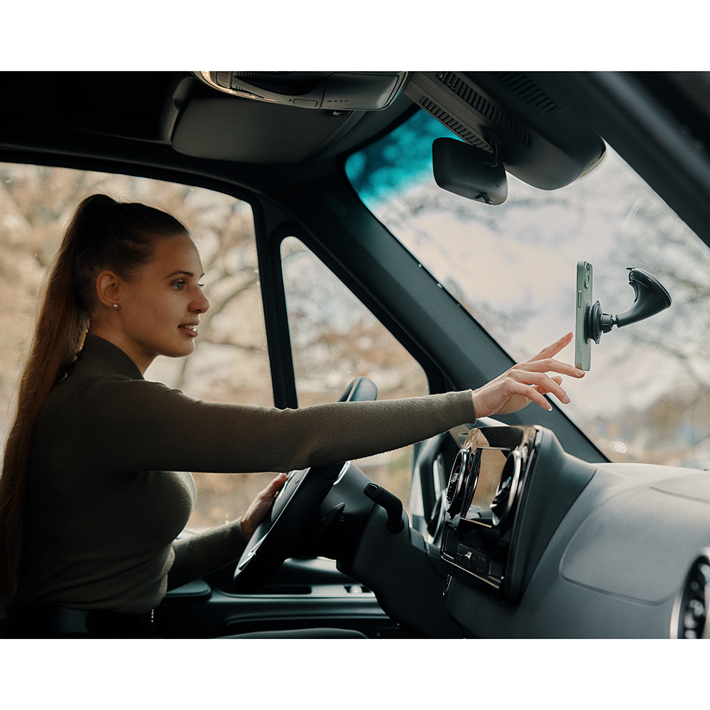 Thanks to the ingeniously intuitive combination of magnetic force and negative pressure, the smartphone can be operated with one hand and can be rotated 360°, while a ball catch prevents it from turning during the journey.