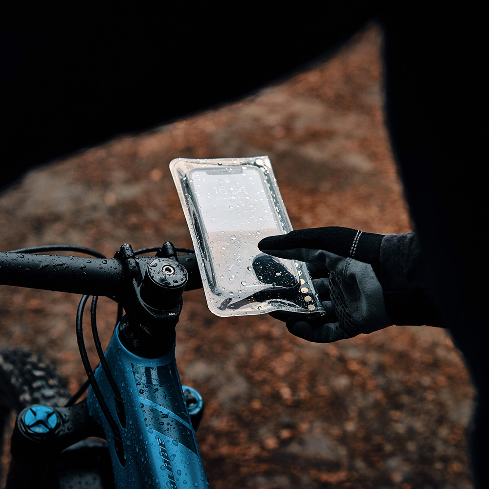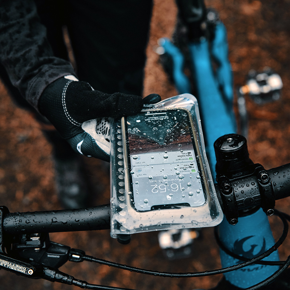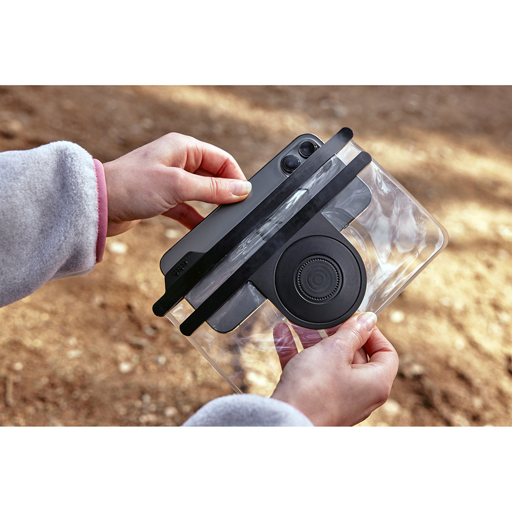 The universal case with VACUUM geometry and HERMETIC closure safely protects the smartphone from water, mud and dust on and off the base.