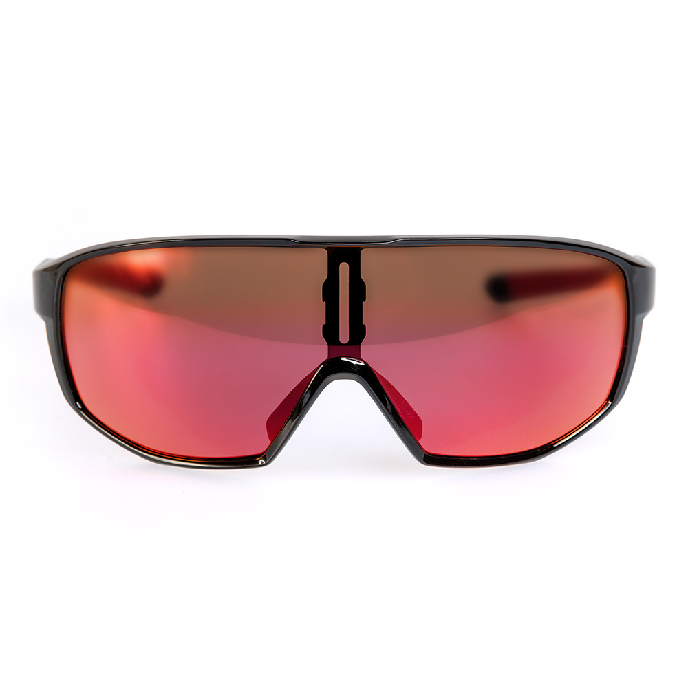 Non-powered glasses with adjustable frame and high impact single wrap Red 'Revo' mirrored lens which changes colour when viewed from different angles, Red to Orange to Yellow.