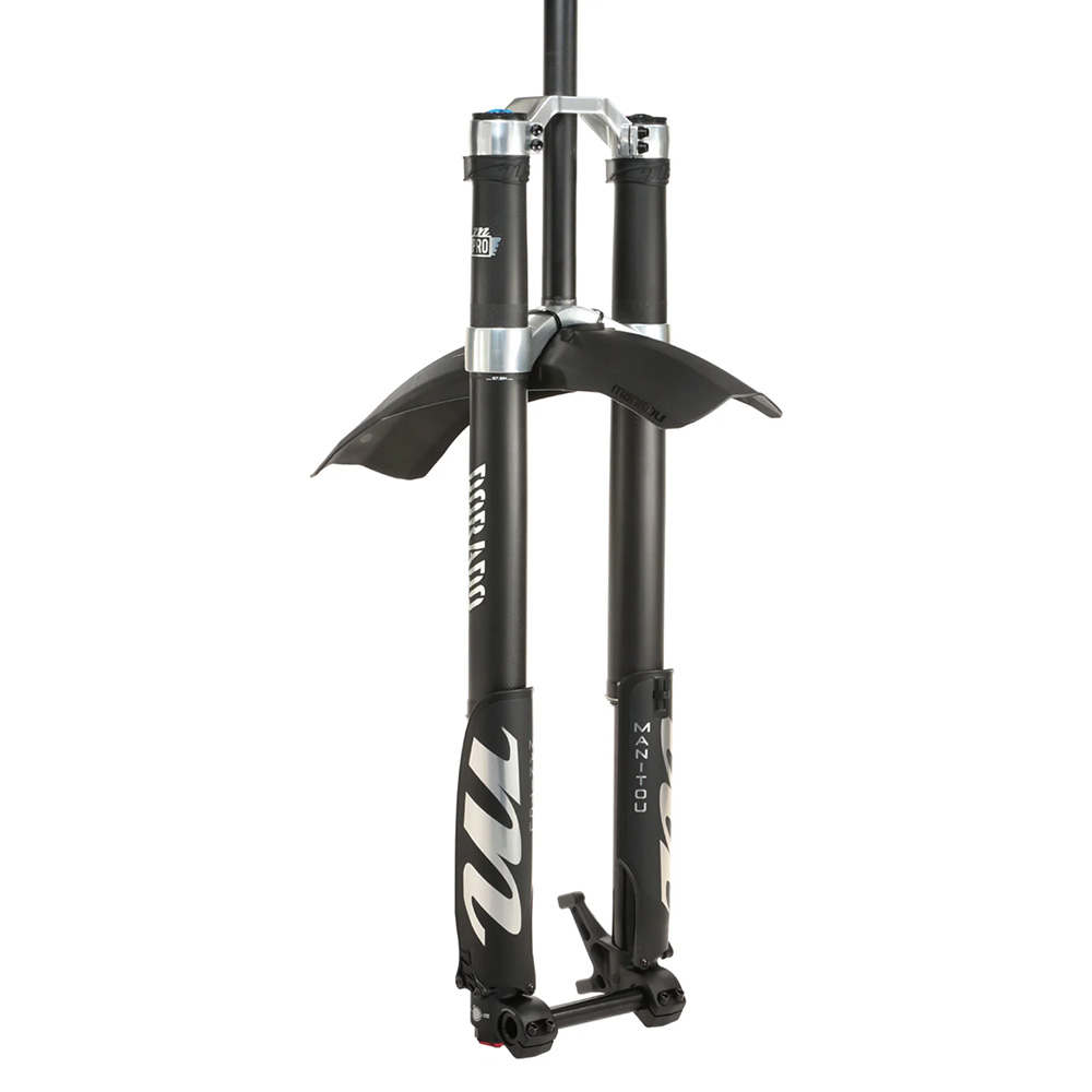 New direct mount fender is reversible, allowing for two orientations "moto" for increased front of fork coverage, "bike" for increased behind fork coverage.