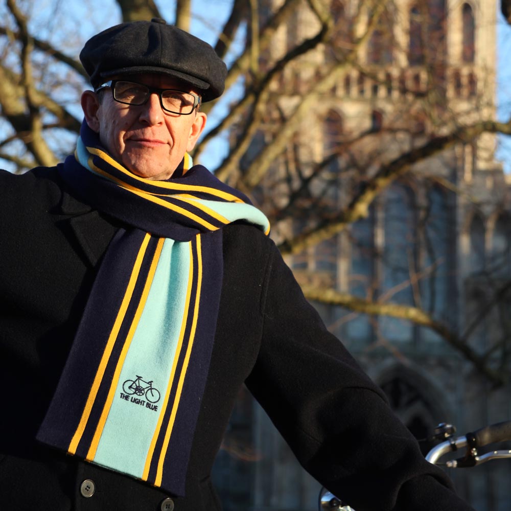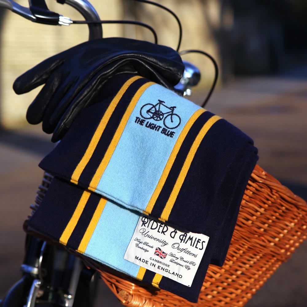 Each scarf is approximately 6ft long (180cm) and has The Light Blue Old Bike design embroidered on one end.