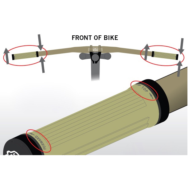 Rearward Facing Angled Palm Grooves; When braking or steep descending, the majority of the torque and grip is concentrated through the palm. Grooves cut with a rearward facing angle give improved grip in this situation. As the ramped groove is cut into the grip, it gives a comfortable, large surface area for the palm in normal riding conditions.