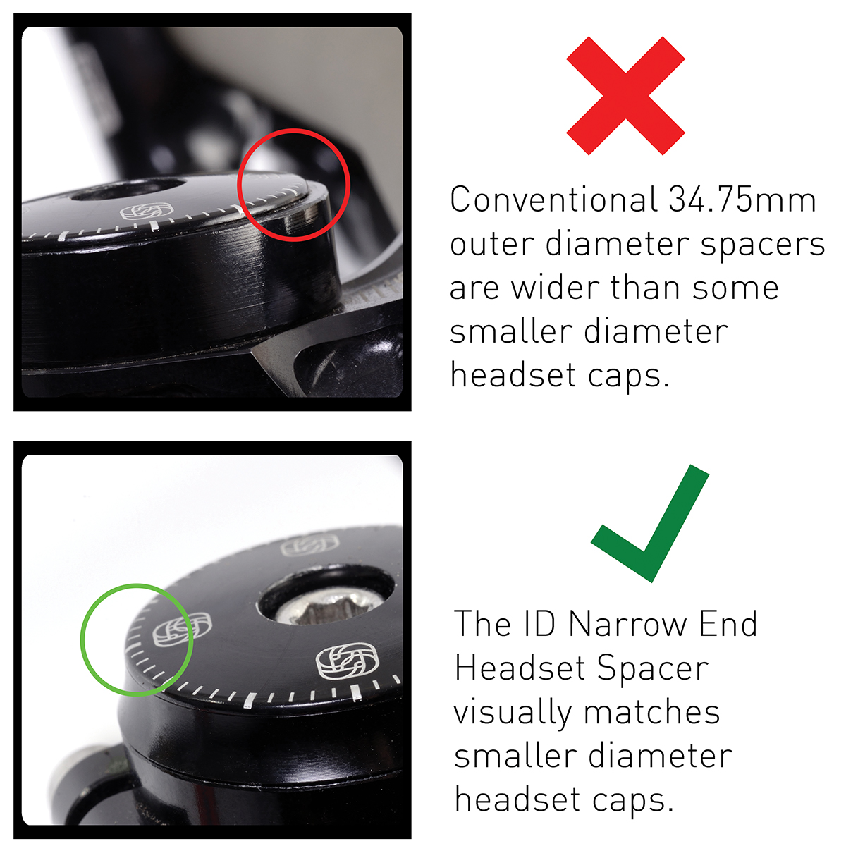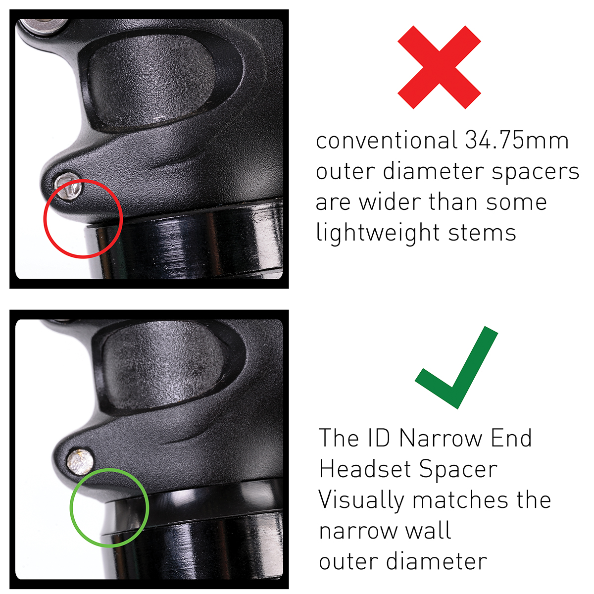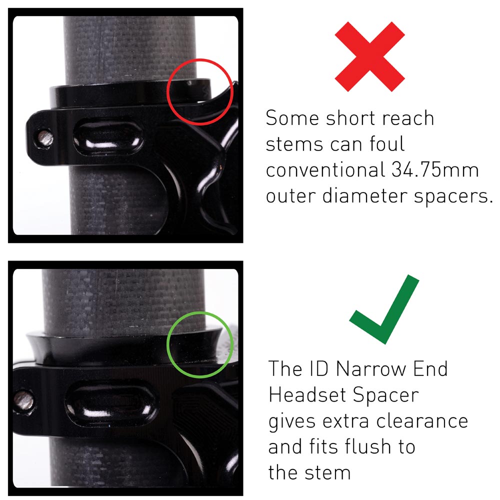 - Gain extra clearance with short reach stems that may foul the conventional 34.75mm outer diameter spacers.