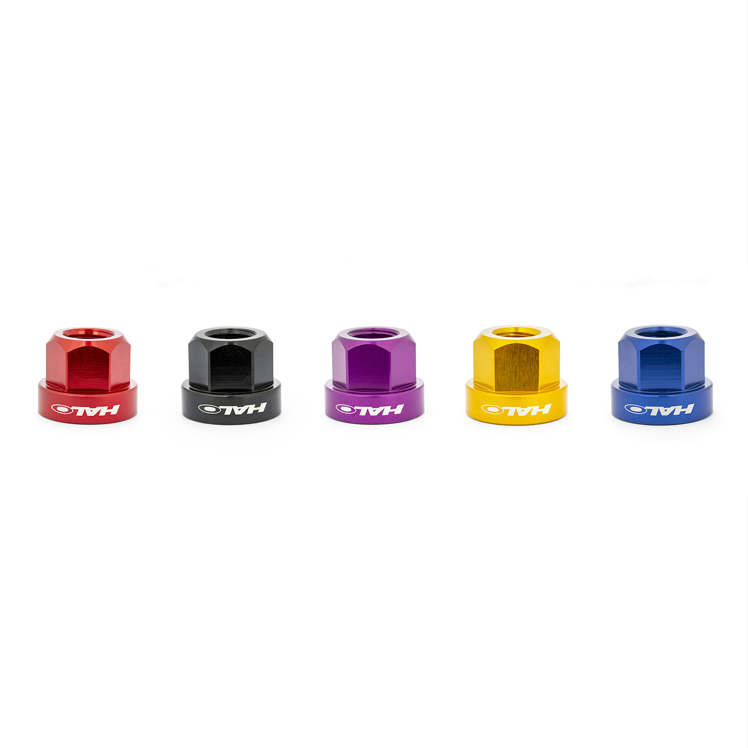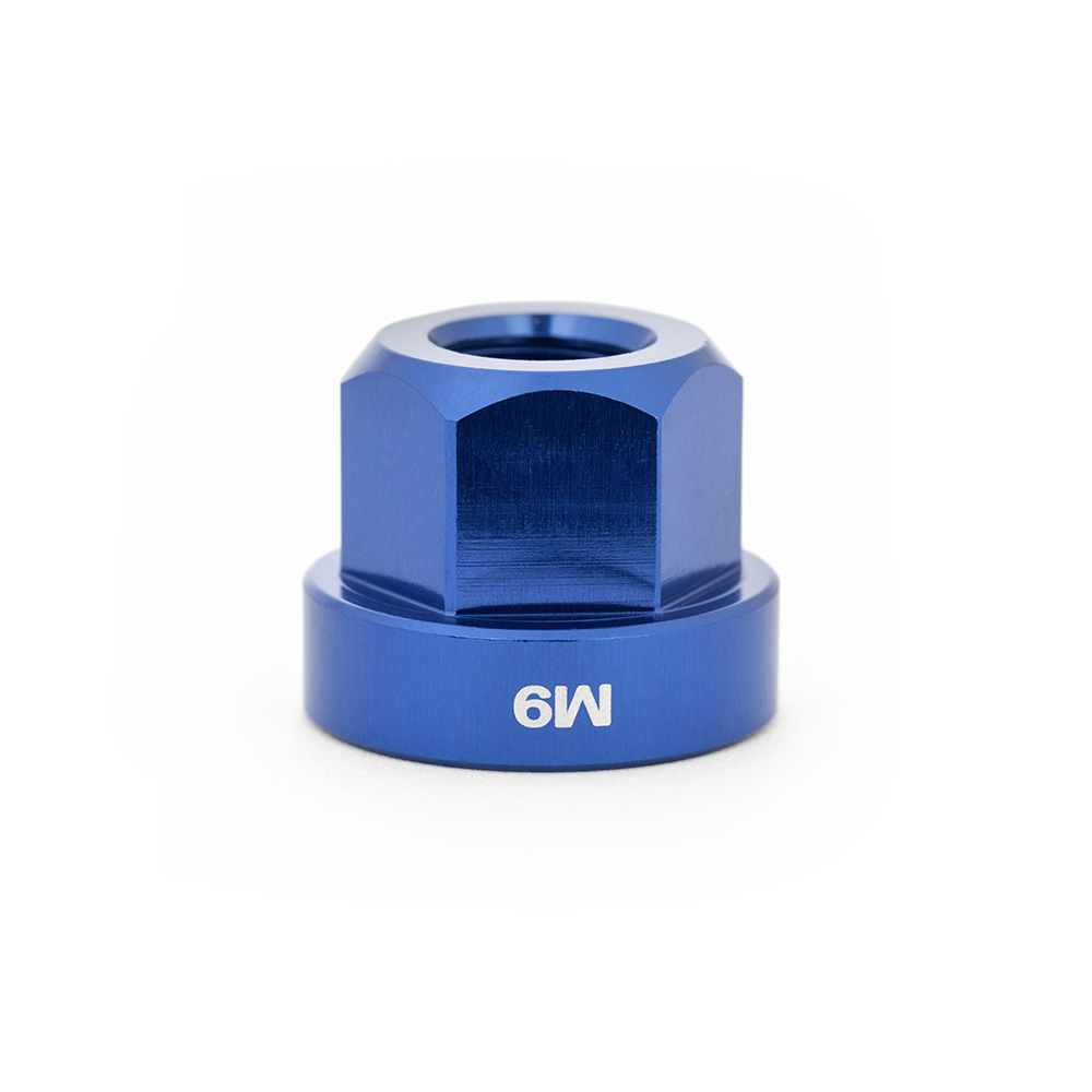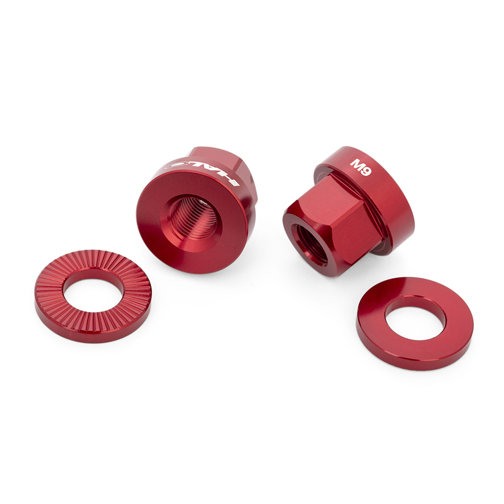 Precision-engineered 6061 alloy axle nuts with washers, CNC-machined for accuracy and anodised for durability.