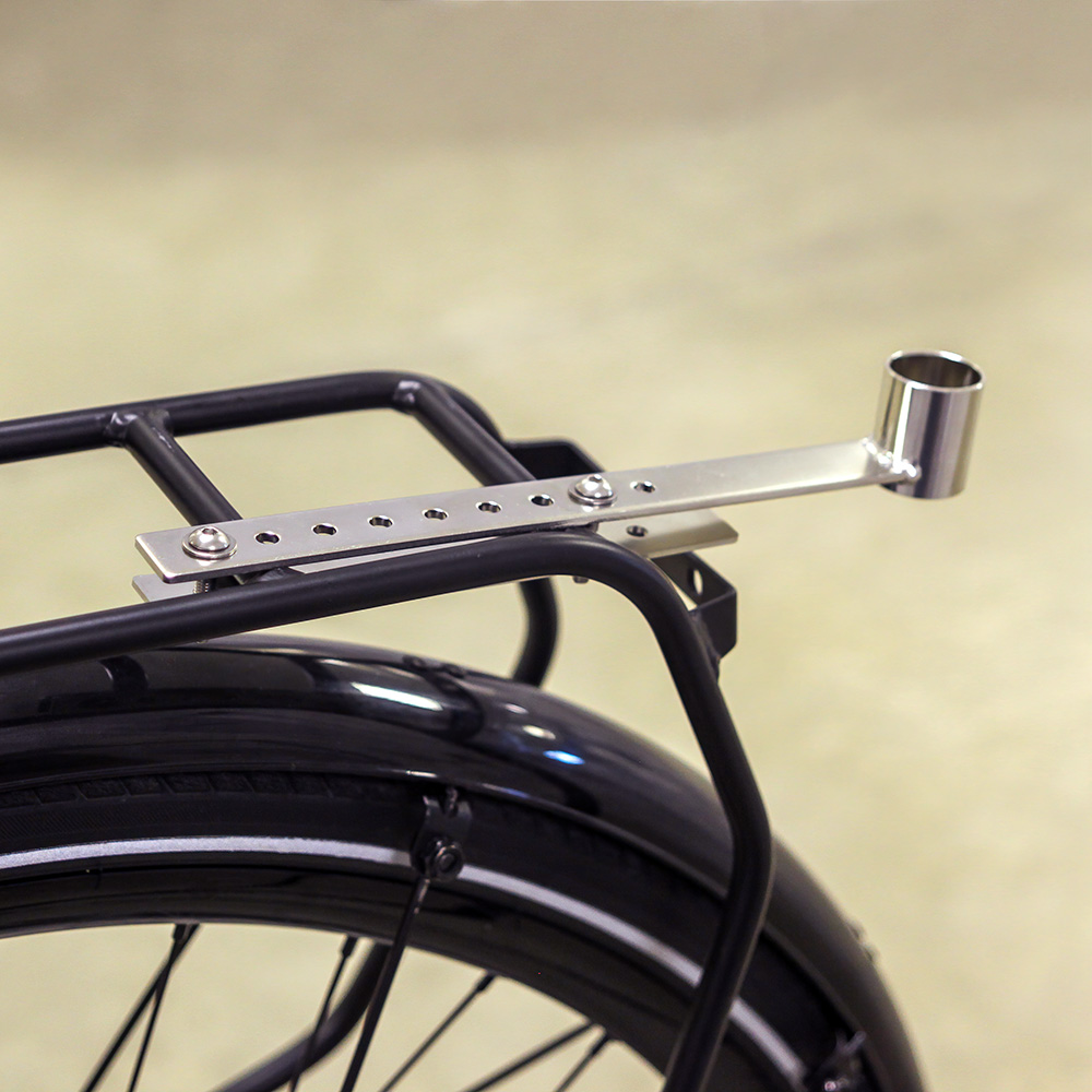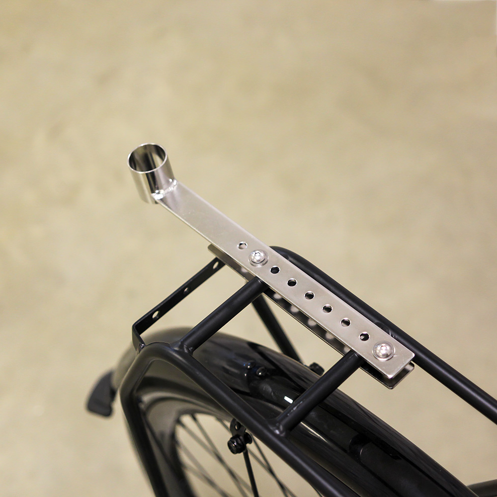 A simple solution to the question of where to put a seat post fitting rear light when you have a fully loaded rear rack. This universal clamp-on fitting bracket replicates a short piece of seatpost, and places it well out of the way of the rear rack, thus allowing you to fit your favourite tail lamp securely and safely.