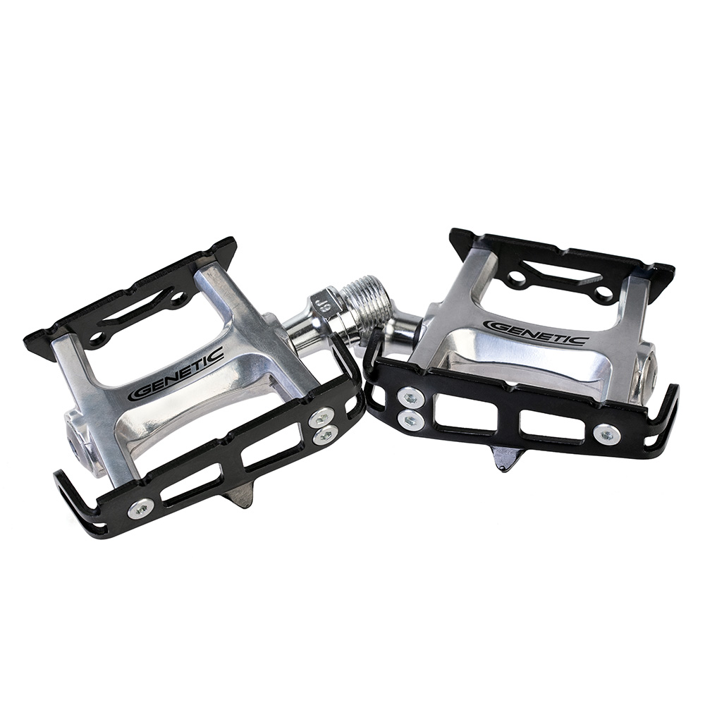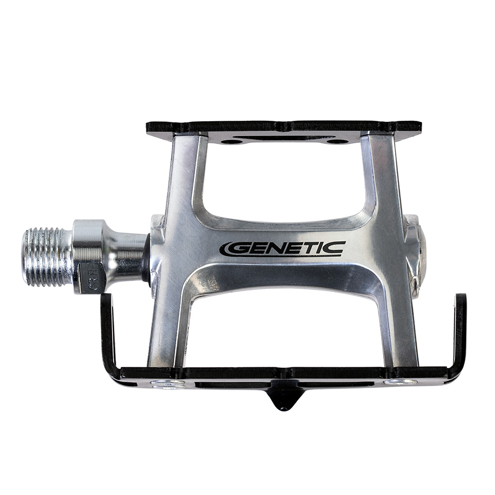 Our Pro Track pedals give any bike that classic racing look with modern reliability. Featuring high quality sealed bearings and chromoly axles, these are year-round all-season pedals. A low-profile pedal designed for track but just as ideal for street use, match them up with some of our cages and straps and you will have yourself a pedal perfect for year round riding, in all conditions. The body of the pedal is high lustre polished aluminium with the option for either a silver body with black anodised cage plates or a complete black anodised pedal. Both are drilled for cages and straps.