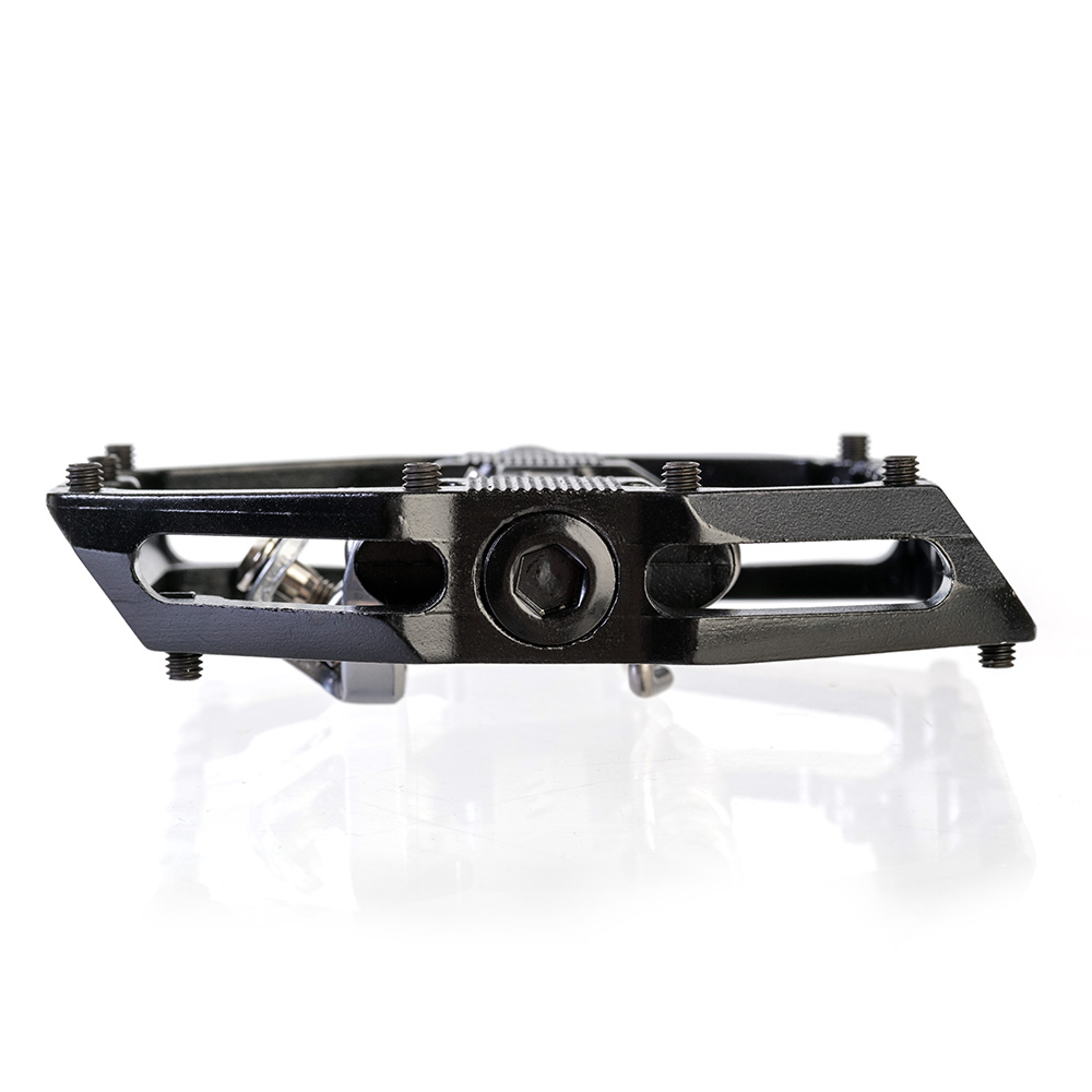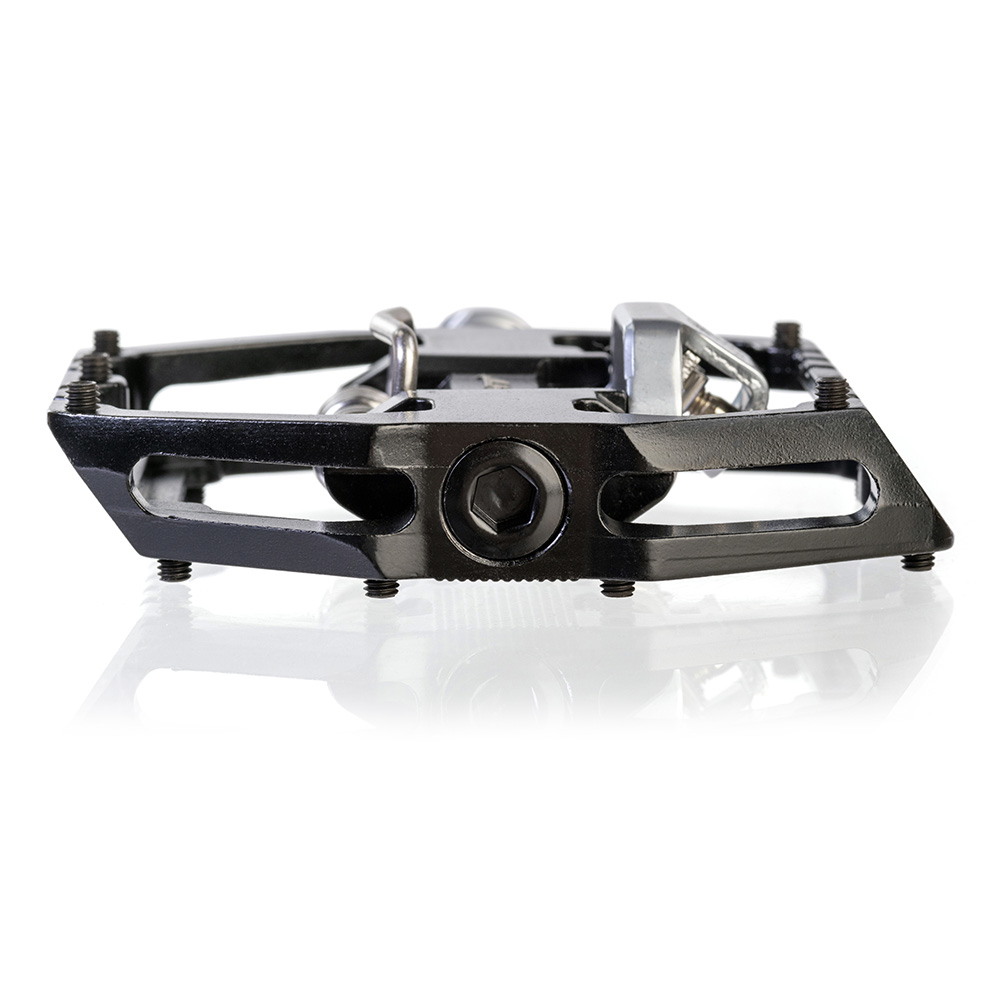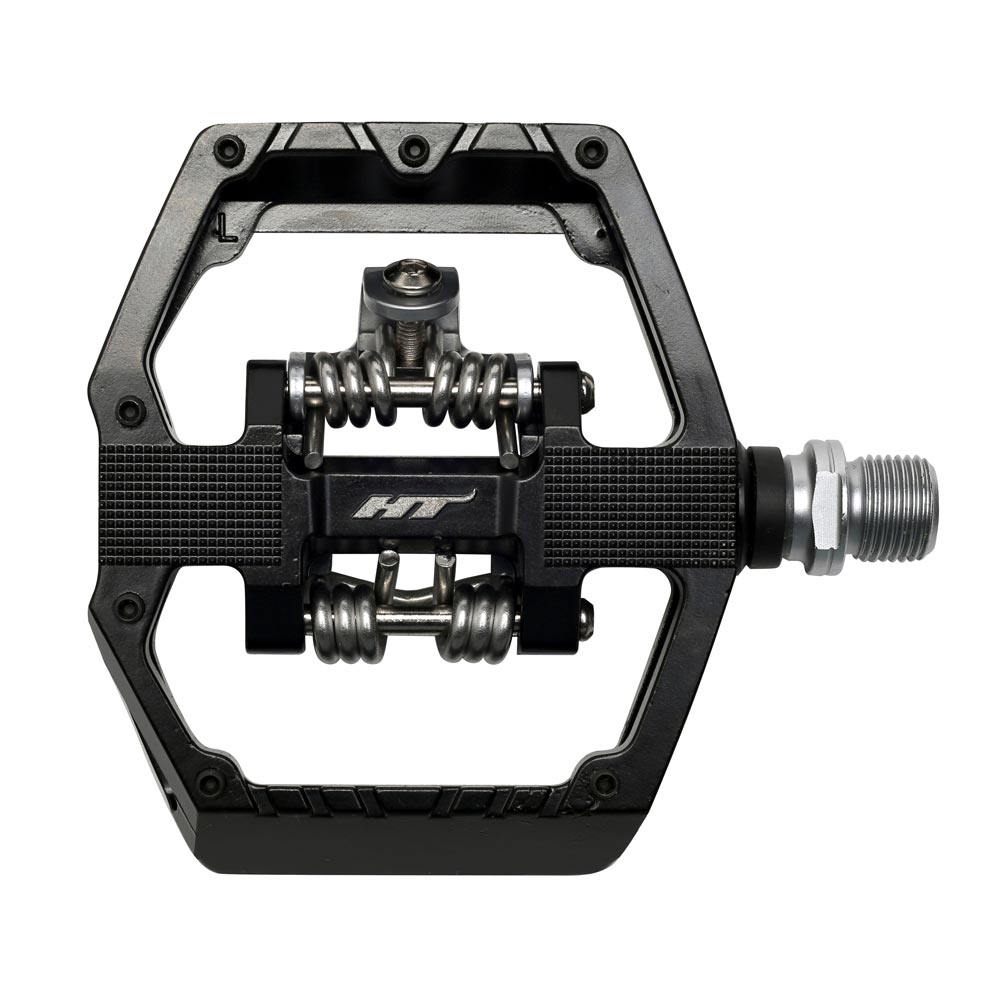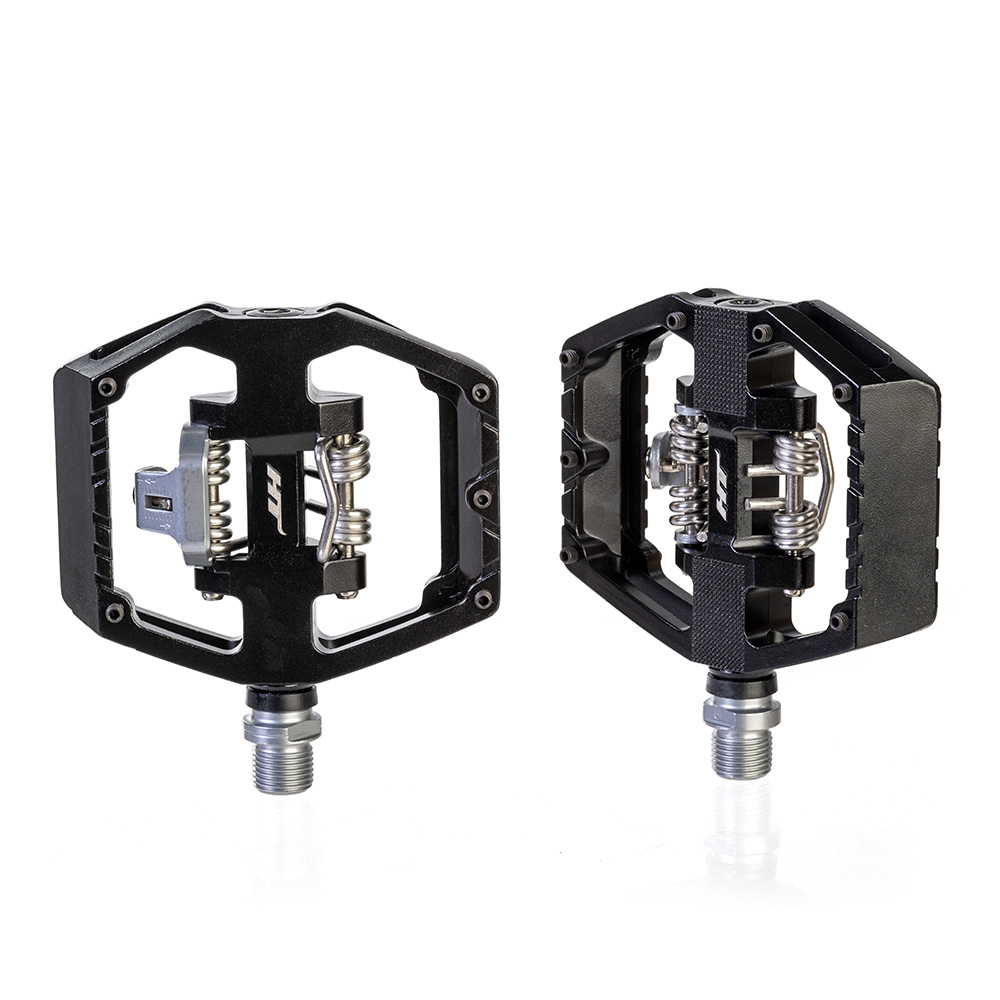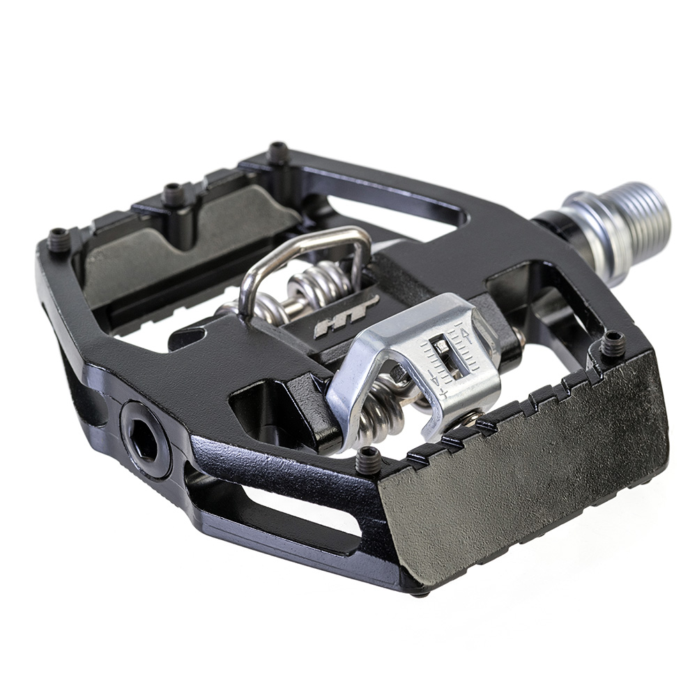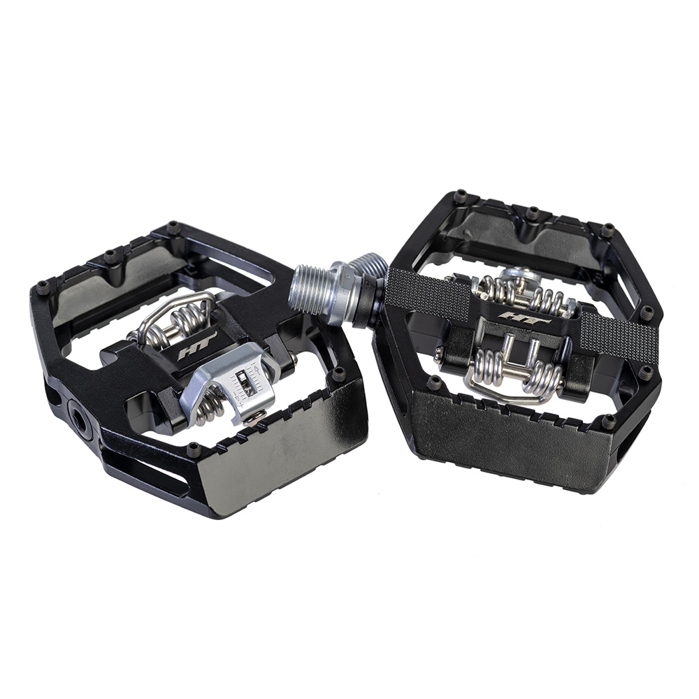 Double sided pedal, offering both the great HT ‘clipless’ binding system on one side, combined with a shoe biting flat alloy platform with grip pins on the other.
