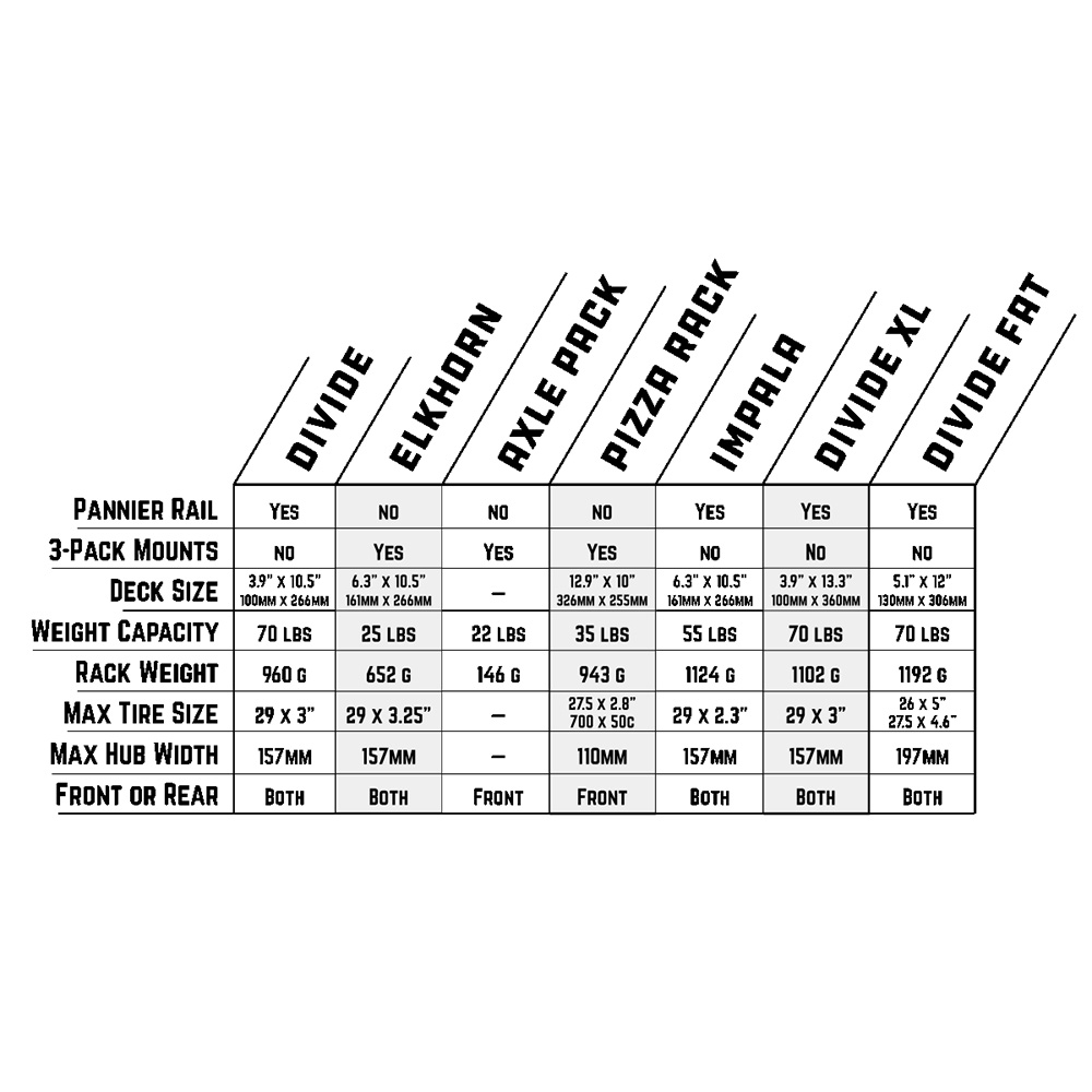 The extended side frames with extra low pannier rails carry the weight of panniers on the wheel centre instead of 6” above it like a standard rack, such as the Divide. This dramatically lowers the bike’s centre of gravity and provides ultra-stable handling.