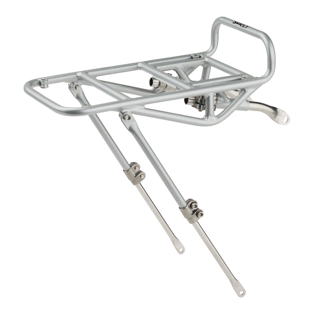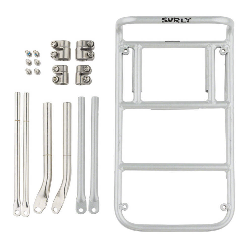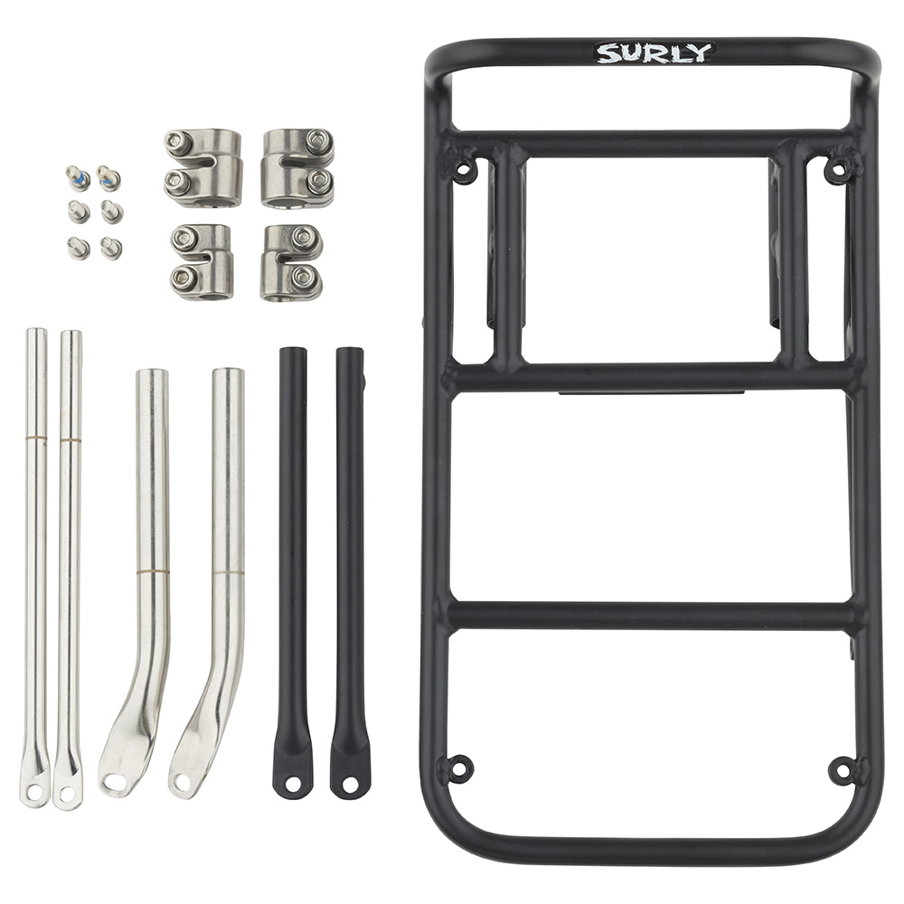 A traditional-style Porteur rack that mounts securely to mid-blade and crown eyelets of Surly forks, making it compatible with fat bike and 29+ wheels.