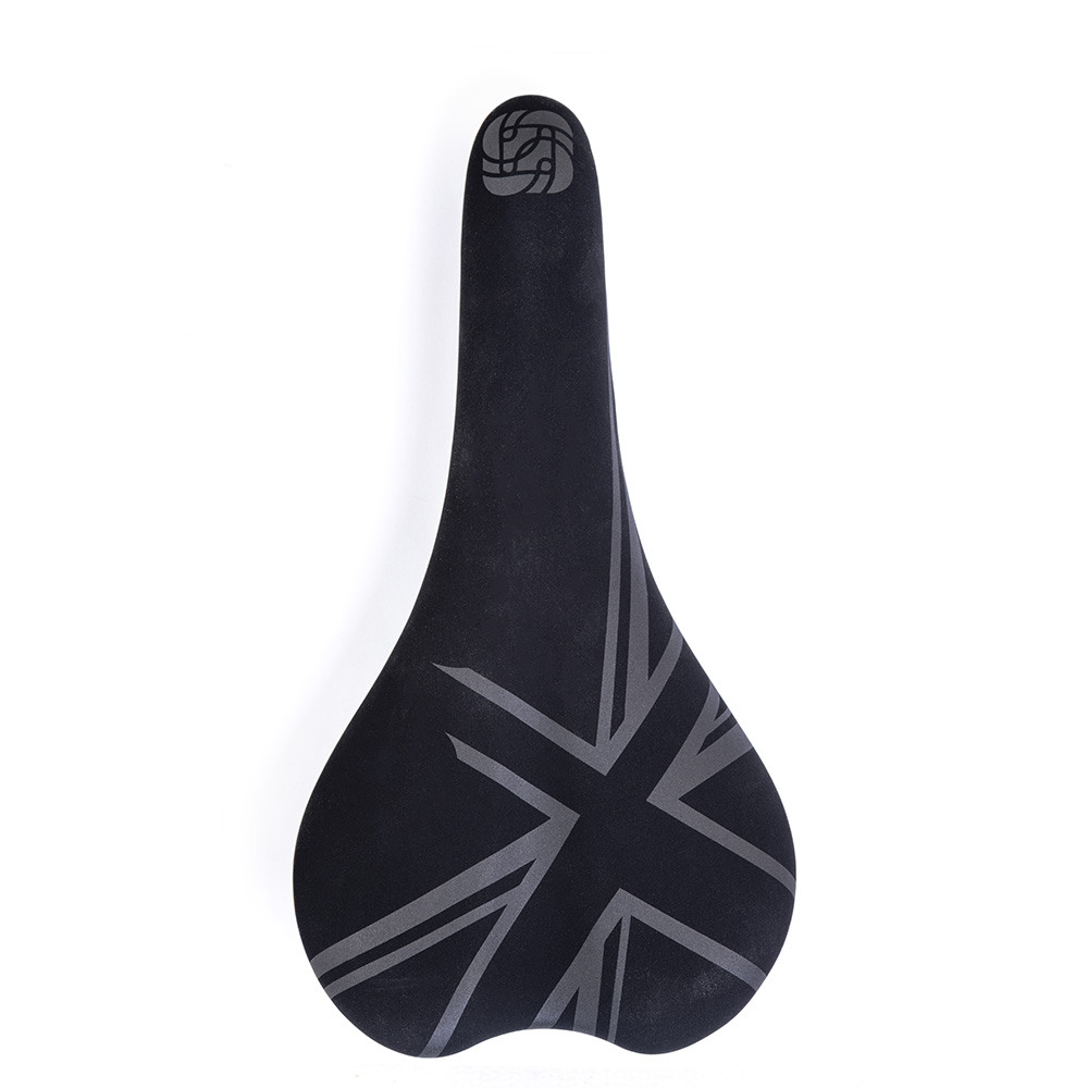 The Longstanding R-Series saddle is a go-to for XC, Gravel and Road riding with a Black Vinyl cover and grey printed Union Jack and Gusset logo, a timeless classic.