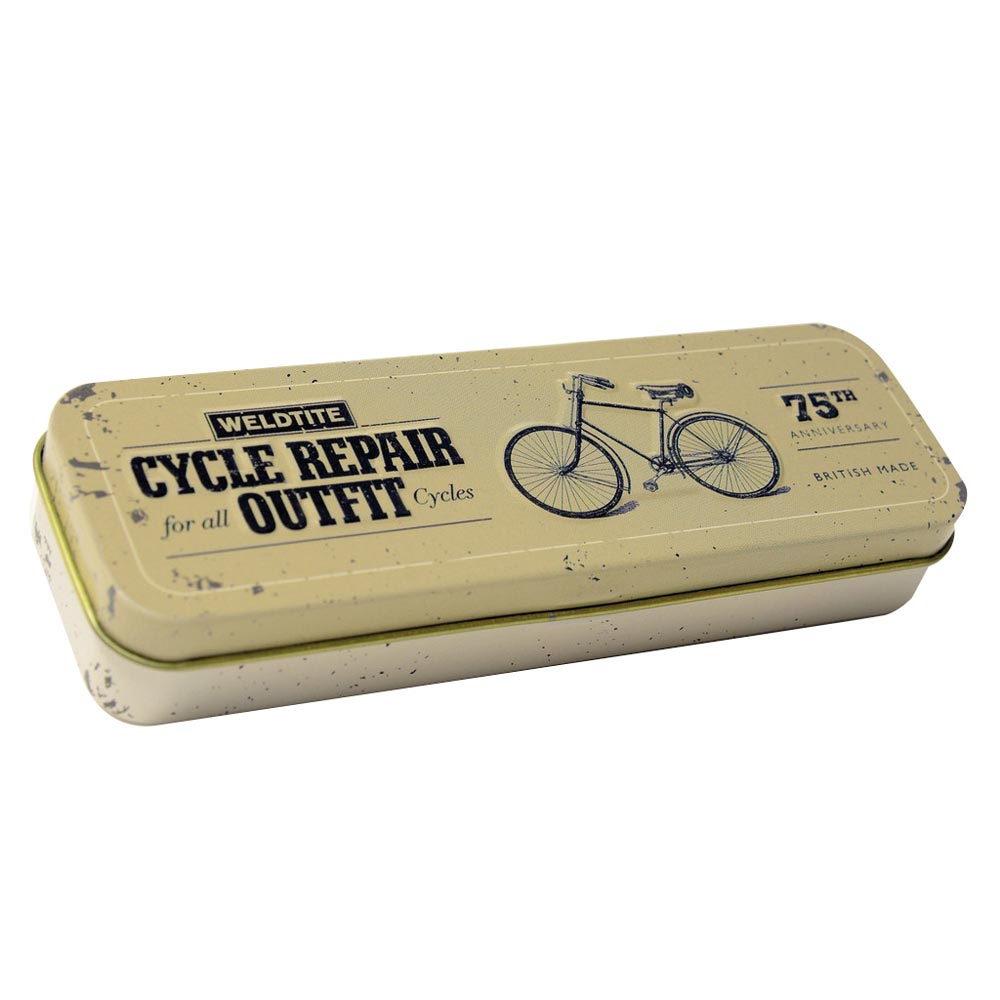 Arriving in a stylish vintage tin that fits perfectly in your saddle bag, this handy repair kit has everything you need to fix punctures on the go – including durable feathered-edge patches, tyre levers and a tube of rubber solution.