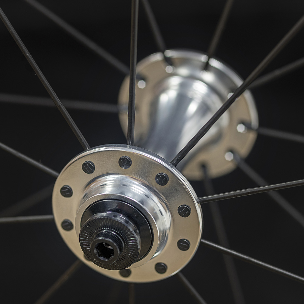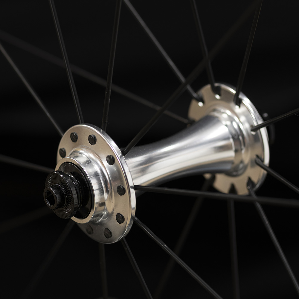 Hand built with lightweight double butted spokes and featuring a 2:1 (16/8E) rear lacing pattern and wide spaced flanges that combine to reduce lateral flex in the rear wheel. The front wheel is built radial with a lightweight 20h RS2 hub.