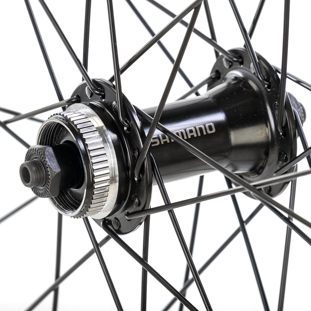 We have hand-built these wheels with Shimano's CL 400 series sealed bearing QR hubs, using reliable Black ED-coated plain gauge spokes and brass nipples.